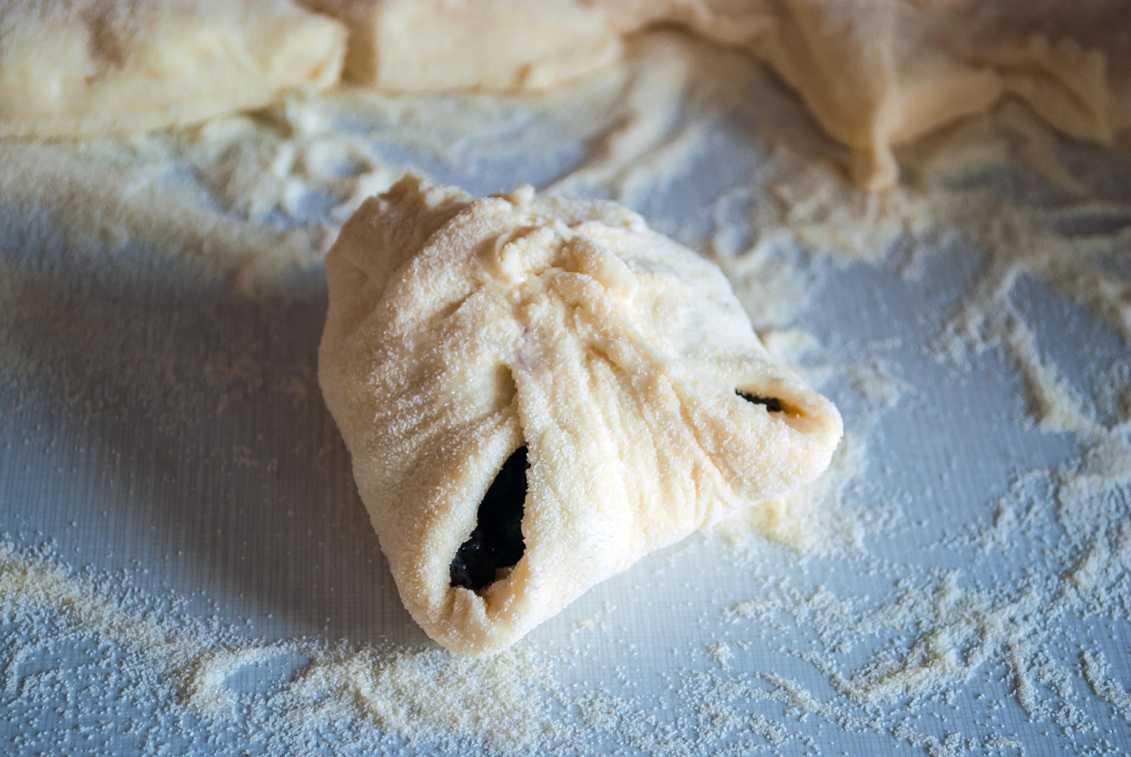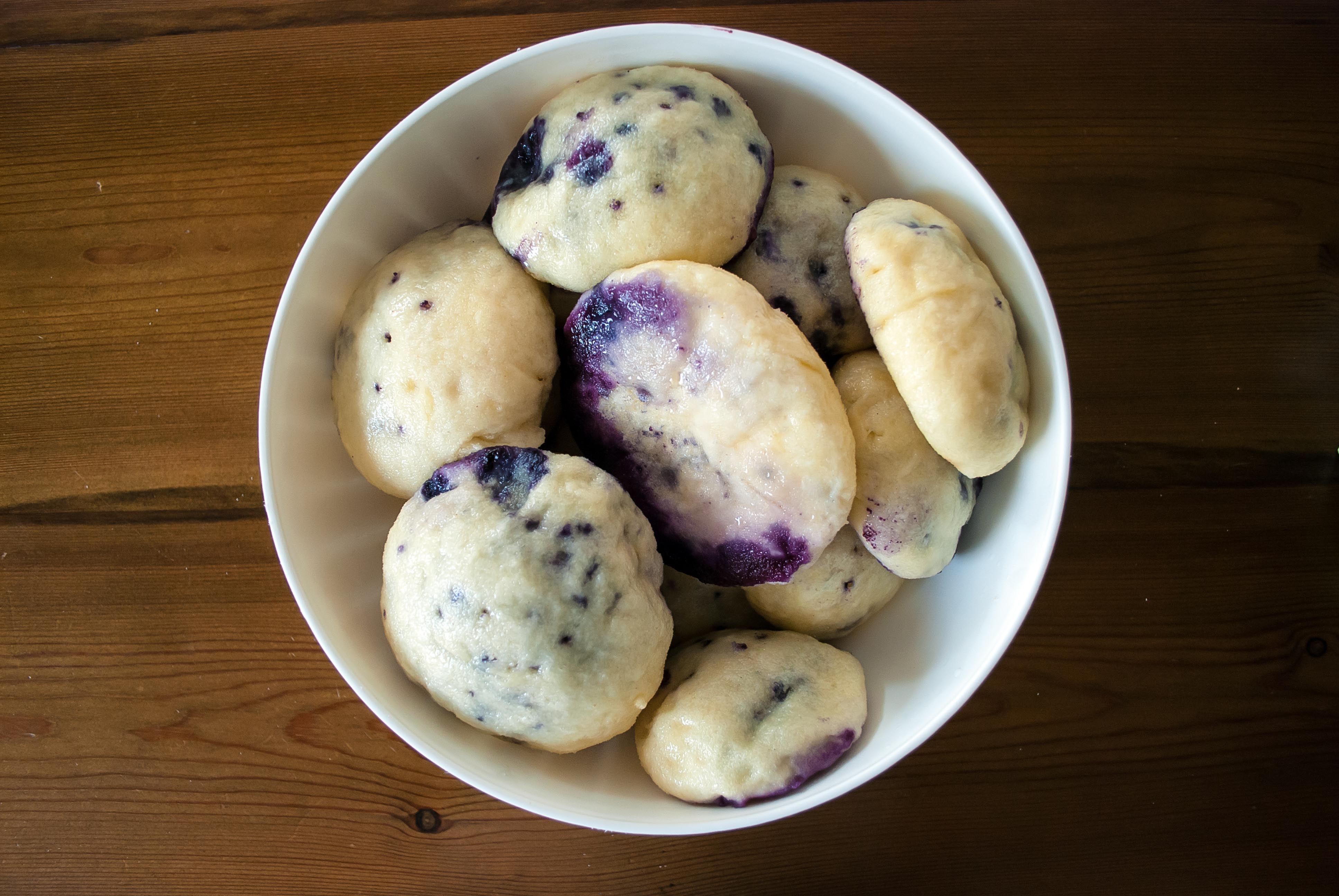 Ingredience: 750 g polohrubé mouky, 1 lžička soli, 2 lžíce cukru, 20 g másla, 2 lžičky sušeného droždí, 600 ml vlažného mléka, 2 žloutky rozšlehané v mléce a asi 0,5 litru borůvek.